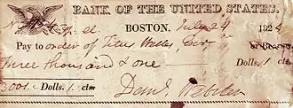 As Calhoun drifted away from the Democratic Party and occasionally cooperated with the National Republicans to oppose Jackson, some contemporaries began to refer to Calhoun, Webster, and Clay as "the Great Triumvirate."[93] At the same time, Webster's alliance with Jackson in the Nullification Crisis caused some observers to wonder if he would join the Democratic Party or found a new party centered on their nationalistic vision.[94] Jackson's decision to remove government deposits from the national bank in late 1833 ended any possibility of a Webster-Jackson alliance and helped to solidify partisan lines.[95] As chairman of the Senate Finance Committee, Webster led the Senate's effort to prevent Jackson's secretary of the treasury, Roger Taney, from removing government deposits.[96] As the national bank's charter was due to expire in 1836, before the end of Jackson's term, he attempted to save the national bank through a compromise measure, but Democrats rejected his proposal. Ultimately, the Senate was unable to prevent the deposit removals or the expiration of the national bank's charter, but it did pass resolutions censuring Jackson and Taney. Webster's decision to vote for the censure resolution caused a permanent break with Jackson.[97]