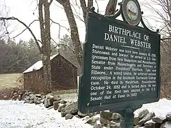 Daniel Webster was born on January 18, 1782, in Salisbury, New Hampshire, at a location within the present-day city of Franklin. His parents were Abigail (née Eastman) and Ebenezer Webster, a farmer and local official who served in the French and Indian War and the American Revolutionary War. Ebenezer's ancestor, the English-born Thomas Webster, had migrated to North America around 1636. Ebenezer had three children from a previous marriage who survived to maturity, as well as five children from his marriage to Abigail; Webster was the second-youngest of the eight siblings.[3] He was particularly close to his older brother, Ezekiel, who was born in 1780.[4] As a youth, he helped work the family farm but was frequently in poor health. With the encouragement of his parents and tutors, he often read works by authors such as Alexander Pope and Isaac Watts.[5]
