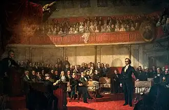 After Jackson took office, Webster opposed most of the measures favored by the new administration, including the Indian Removal Act and the establishment of the spoils system.[72] The Jackson administration suffered from factionalism between supporters of Secretary of State Van Buren and Vice President Calhoun, the latter of whom took a prominent role in propounding the doctrine of nullification. Calhoun held that the states had the power to "nullify" laws, and he and his allies sought to nullify the high tariff rates imposed by the Tariff of 1828 (which they referred to as the "Tariff of Abominations").[73] During a debate over land policy in January 1830, South Carolina Senator Robert Y. Hayne, in an effort to sway the West against the North and the tariff, accused the North of attempting to limit Western expansion for their own benefit. Hayne served as a surrogate for Vice President Calhoun, who could not himself address the Senate on the issue due to his status as the Senate's presiding officer.[74] Webster objected to the sectional attack on the North, but even more strongly objected to Hayne's pro-states' rights position. Speaking before the Senate, he articulated his belief in a "perpetual" union and attacked the institution of slavery, baiting Hayne into expounding on the doctrine of nullification on the Senate floor.[75]