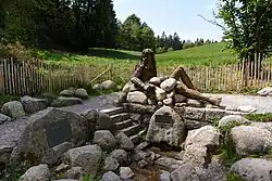 The hydrogeographical source of the Danube at St. Martin's Chapel in Furtwangen im Schwarzwald Germany: the Bregquelle, the source of the Danube's longest headstream, the Breg, where the Danube is symbolized by the Roman allegory for the river, Danuvius.