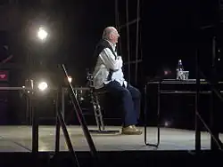 In 2005, Fo revealed plans to run for Mayor of Milan, the most economically important city in Italy, the following year. He said it was part of his ongoing fight to rid Milan of Berlusconi's political colleague Gabriele Albertini, the incumbent mayor.[106] Ostracised by Italian television (both state—RAI having shunted his latest show off to a graveyard slot—and commercial—three quarters owned by Fo's long-time adversary Berlusconi), Fo instead elected to campaign on stage.[107] Under the slogan "I am not a moderate", he opposed the centre-right administration's plans to demolish parts of the city centre and vowed to chase out those "money-grabbing bastards who have run this city for decades".[108][109] Securing 23.4% of the vote in the primary election of centre-left The Union in January 2006, he was ultimately unsuccessful, finishing second to Milan's former police chief Bruno Ferrante.[110]