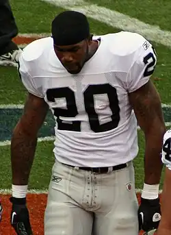 At training camp, McFadden impressed Raiders coach Lane Kiffin with his ability to take instructions once and seamlessly incorporate them into his game. Media observers considered him the most complete Raiders rookie at this stage since Marcus Allen.[67] On September 8, McFadden made his NFL debut against the Denver Broncos, where he had nine carries for 46 yards on in the 41–14 loss. McFadden scored his first professional touchdown against the Kansas City Chiefs on September 14, 2008, his second NFL game, in which he gained 164 yards on 21 carries.[68] McFadden also suffered an injury to his big toe in this game, which limited him for the next 14 games, including three missed games. On November 23, in a game against the Broncos, McFadden scored two touchdowns, his first multi-touchdown game in his career. He ended the season with 499 yards on 113 attempts, with four touchdowns. He also made 29 receptions for 285 yards.[69] Raiders interim head coach Tom Cable, who took over after Kiffin was fired by owner Al Davis, was criticized for not playing McFadden later in the season. Responding to criticism, Cable stated “Well what really dictated was the rotation we were in, terms of the game, the flow of the game. I think [Justin] Fargas played pretty well. It’s just those situations present themselves."[70] Oakland Tribune writer Jerry McDonald responded to Cable's statement, saying "If the flow of the game means keeping McFadden, an excellent receiving back, off the field on third down plays which call for a pass, then the flow needs to be changed by the play-caller."[70]
