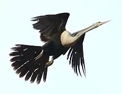 The darters, anhingas, or snakebirds are mainly tropical waterbirds in the family Anhingidae, which contains a single genus, Anhinga. There are four living species, three of which are very common and widespread while the fourth is rarer and classified as near-threatened by the IUCN. The term snakebird is usually used without any additions to signify whichever of the completely allopatric species occurs in any one region. It refers to their long thin neck, which has a snake-like appearance when they swim with their bodies submerged, or when mated pairs twist it during their bonding displays. "Darter" is used with a geographical term when referring to particular species. It alludes to their manner of procuring food, as they impale fishes with their thin, pointed beak. The American darter (A. anhinga) is more commonly known as the anhinga. It is sometimes called "water turkey" in the southern United States; though the anhinga is quite unrelated to the wild turkey, they are both large, blackish birds with long tails that are sometimes hunted for food.[2]