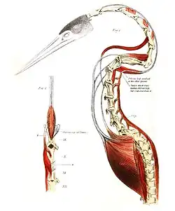 Spine, tendons and musculature of the neck showing the elongated vertebrae (3–8) that enable the darting movements. The tendon that runs behind the spine runs under a fibrous bridge ("bridge of Dönitz") in the shortened ninth vertebra.