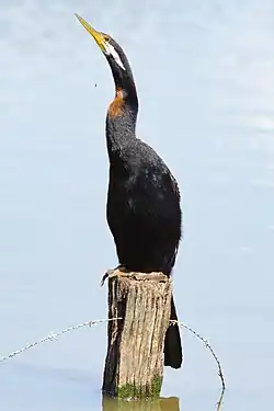 Darters feed mainly on mid-sized fish;[5] far more rarely, they eat other aquatic vertebrates[6] and large invertebrates[7] of comparable size. These birds are foot-propelled divers which quietly stalk and ambush their prey; then they use their sharply pointed bill to impale the food animal. They do not dive deep but make use of their low buoyancy made possible by wettable plumage, small air sacs and denser bones.[8] On the underside of the cervical vertebrae 5–7 is a keel, which allows for muscles to attach to form a hinge-like mechanism that can project the neck, head and bill forward like a throwing spear. After they have stabbed the prey, they return to the surface where they toss their food into the air and catch it again, so that they can swallow it head-first. Like cormorants, they have a vestigial preen gland and their plumage gets wet during diving. To dry their feathers after diving, darters move to a safe location and spread their wings.[4] Darters go through a synchronous moult of all their primaries and secondaries making them temporarily flightless, although it is possible that some individuals go through incomplete moults.[9]