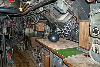 The interior U-boat mock-up was mounted five metres off the floor and was shaken, rocked, and tilted up to 45 degrees by means of a hydraulic apparatus, and was vigorously shaken to simulate depth charge attacks. Petersen was admittedly obsessive about the structural detail of the U-boat set, remarking that "every screw" in the set was an authentic facsimile of the kind used in a World War II U-boat. In this he was considerably assisted by the numerous photographs Lothar-Günther Buchheim had taken during his own voyage on the historical U-96, some of which had been published in his 1976 book, U-Boot-Krieg ("U-Boat War").