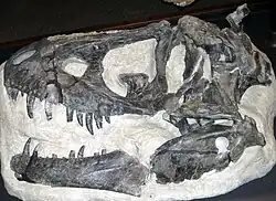 A full-grown Dinosaur Park Daspletosaurus (TMP 85.62.1) exhibits tyrannosaur bite marks on its skull. While it is possible that the bites were attributable to other species, intraspecific aggression such as facial biting is very common among predators. Facial bites are seen in other tyrannosaurs like Gorgosaurus and Tyrannosaurus, as well as in other theropod genera like Sinraptor and Saurornitholestes. Darren Tanke and Phil Currie hypothesize that the bites are due to intraspecific competition for territory or resources, or for dominance within a social group.[42] A young specimen of the tyrannosaurid (TMP 1994.143.1), initially identified as the Dinosaur Park Daspletosaurus but subsequently referred to Gorgosaurus libratus, also shows bite marks on the face that were inflicted by another tyrannosaur. The bite marks are healed over, indicating that the animal survived the bite.[42][43][44]