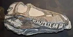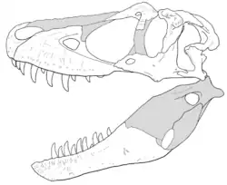 Daspletosaurus had a massive skull that could reach more than 1 metre (3 ft 3 in) in length.[5] The bones were heavily constructed and some, including the nasal bones on top of the snout, were fused for strength. Large fenestrae (openings) in the skull reduced its weight. An adult Daspletosaurus was armed with about six dozen teeth that were very long but oval in cross section rather than blade-like. Unlike its other teeth, those in the premaxilla at the end of the upper jaw had a D-shaped cross section, an example of heterodonty always seen in tyrannosaurids. Unique skull features included the rough outer surface of the maxilla (upper jaw bone) and the pronounced crests around the eyes on the lacrimal, postorbital, and jugal bones. The orbit (eye socket) was a tall oval, somewhere in between the circular shape seen in Gorgosaurus and the 'keyhole' shape of Tyrannosaurus.[13][7][10] Split carinae (edges)[33] have been found on Daspletosaurus teeth.[34]
