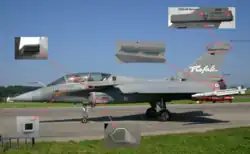 The Damocles designation pod was described as "lacking competitiveness" when compared to rivals such as the Sniper and LITENING pods;[105] so work began on an upgraded pod, designated Damocles XF, with additional sensors and added ability to transmit live video feeds.[106] A new Thales targeting pod, the Talios, was officially unveiled at the 2014 Farnborough Air Show[107] and is expected to be integrated on the Rafale by 2018.[108] Thales' Areos reconnaissance pod is an all-weather, night-and-day-capable reconnaissance system employed on the Rafale, and provides a significantly improved reconnaissance capability over preceding platforms.[109][N 5] Areos has been designed to perform reconnaissance under various mission profiles and condition, using multiple day/night sensors and its own independent communications datalinks.[104]
