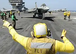 The Rafale M is fully compatible with United States Navy aircraft carriers and some French Navy pilots have qualified to fly the aircraft from US Navy flight decks.[133] On 4 June 2010, during an exercise on USS Harry S. Truman, a French Rafale became the first jet fighter of a foreign navy to have its engine replaced on board an American aircraft carrier.[134]