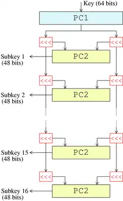 Figure 3 illustrates the key schedule for encryption—the algorithm which generates the subkeys. Initially, 56 bits of the key are selected from the initial 64 by Permuted Choice 1 (PC-1)—the remaining eight bits are either discarded or used as parity check bits. The 56 bits are then divided into two 28-bit halves; each half is thereafter treated separately. In successive rounds, both halves are rotated left by one or two bits (specified for each round), and then 48 subkey bits are selected by Permuted Choice 2 (PC-2)—24 bits from the left half, and 24 from the right. The rotations (denoted by "<<<" in the diagram) mean that a different set of bits is used in each subkey; each bit is used in approximately 14 out of the 16 subkeys.