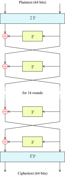 The ⊕ symbol denotes the exclusive-OR (XOR) operation. The F-function scrambles half a block together with some of the key. The output from the F-function is then combined with the other half of the block, and the halves are swapped before the next round. After the final round, the halves are swapped; this is a feature of the Feistel structure which makes encryption and decryption similar processes.