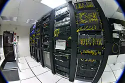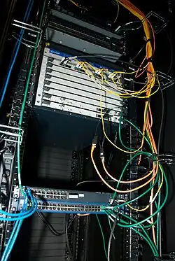 Data centers can vary widely in terms of size, power requirements, redundancy, and overall structure. Four common categories used to segment types of data centers are onsite data centers, colocation facilities, hyperscale data centers, and edge data centers.[6] In particular, colocation centers often host private peering connections between their customers, internet transit providers, cloud providers,[7][8] meet-me rooms for connecting customers together[9] Internet exchange points,[10][11] and landing points and terminal equipment for fiber optic submarine communication cables,[12] which are critical to connecting the internet.[13]