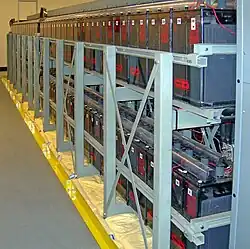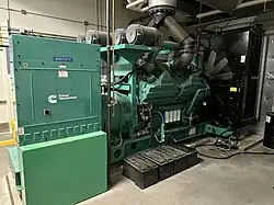 Power supplies, either back up or continuous onsite power consists of one or more uninterruptible power supplies, battery banks, diesel, gas turbine, gas engine generating sets.[72] Greater primary fuel energy efficiency can be achieved with the use of cogeneration technology, generating electricity, heating and cooling onsite.[73]