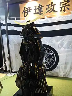 Masamune is known for a few things that made him stand out from other daimyō of the time. In particular, his famous crescent-moon-bearing helmet won him a fearsome reputation. As a child, smallpox robbed him of sight in his right eye, though it is unclear exactly how he lost the organ entirely.[3] Various theories behind the eye's condition exist. Some sources say he plucked out the eye himself when a senior member of the clan pointed out that an enemy could grab it in a fight. Others say that he had his trusted retainer Katakura Kojūrō gouge out the eye for him, making him the "One-Eyed Dragon" of Ōshu.[4]