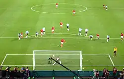 His goal celebration saw him raise his arms and walk away smiling rather than run as he often would.[56] In a UK poll conducted by Channel 4 in 2002, the British public voted the goal No.18 of the 100 Greatest Sporting Moments.[54] In a 2016 Sky Sports poll, it was ranked the best opening day goal in Premier League history.[56] During the 1996–97 season, Beckham became an automatic first-choice player at Manchester United, helping them to retain the Premier League title, and was voted PFA Young Player of the Year by his peers.[57] Prior to the 1997–98 season, Beckham inherited the number 7 shirt, a number previously worn by such United greats as George Best and Eric Cantona.[58] Manchester United started the season well but erratic performances in the second half of the season saw United finish second behind Arsenal.[59] Beckham had the most assists in the league with 13, while his nine Premier League goals included a free kick from the edge of the 18-yard (16 m) box against Manchester United's arch rivals Liverpool at Anfield.[60]