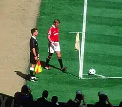 Beckham played in central midfield in United's win over Bayern Munich in the 1999 UEFA Champions League Final, as United's first-choice centre-midfielders Paul Scholes and Roy Keane were suspended for the match.[61] United were losing the match 1–0 at the end of normal time, but won the trophy by scoring two goals in injury time. Both of the goals came from corners taken by Beckham.[61] Those crucial assists, coupled with great performances over the rest of the season, led to him finishing runner up to Rivaldo for 1999's European Footballer of the Year and FIFA World Player of the Year awards.[64]