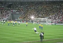 About a month later, however, Capello backtracked on his earlier statement, allowing Beckham to rejoin the team for the match against Real Sociedad on 10 February 2007. The player immediately repaid his head coach's trust by scoring the equalising goal from a 27-yard (25 m) free kick, as Real Madrid eventually recorded a 2–1 victory.[100] In his final UEFA Champions League appearance for the club, Real Madrid were knocked out of the competition by Bayern Munich at the round-of-16 stage (on the away goals rule) on 7 March 2007. Beckham played a pivotal role in all three Madrid goals in the home game, with Bayern goalkeeper Oliver Kahn describing his performance as "world class".[101]