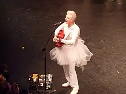 In January 2018, Byrne announced his first solo album in 14 years. American Utopia was released in March through Todo Mundo and Nonesuch Records. He also released the album's first single, "Everybody's Coming to My House", which he co-wrote with Eno.[17] The subsequent tour – which showcased songs from American Utopia alongside highlights from his Talking Heads and solo career to date – was described by NME as being perhaps "the most ambitious and impressive live show of all time", blurring the lines "between gig and theatre, poetry and dance".[18]