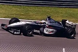 The first rounds of the season proved difficult for Coulthard; In the opening round in Australia, he retired from engine problems, and finished second in Brazil, before being disqualified as the front wing endplates on his car 7mm lower than the required 50mm above the reference plane.[46] Coulthard overcame these setbacks and finished on the podium in the next five races, which included victories in Britain and Monaco. In June, Coulthard signed an extension to his contract, confirming he would remain at McLaren for 2001.[47] A non-points scoring finish in Canada, followed victory in France, a victory which he later described as the most memorable of his career which also happened to be McLaren's only ever win at the Magny-Cours circuit.[48] A hat-trick of podiums followed in the next three rounds and secured a fourth-place finish in Belgium. Coulthard was involved in a multi-car collision on the first lap in Italy. This would be marked by scoring points in the final three rounds, including podiums in Japan and Malaysia. Coulthard finished third in the Drivers' Championship, with 73 points, and McLaren finished second in the Constructors' Champions.[23] For his efforts during the season, Coulthard was awarded his second Hawthorn Memorial Trophy.[42]