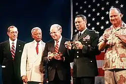 Dinkins (second from the left) with New York governor Mario Cuomo, Secretary of Defense Dick Cheney; Chairman Joint Chiefs of Staff Colin Powell, and General Norman Schwarzkopf