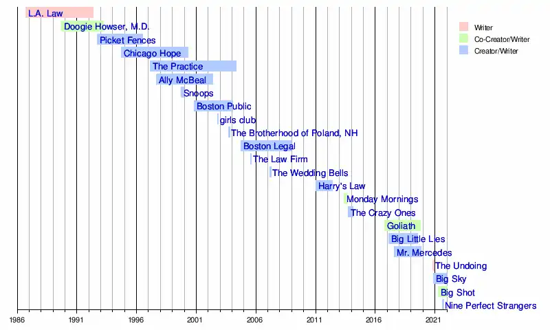 David Edward Kelley (born April 4, 1956) is an American television writer, producer, and former attorney. He has created and/or produced a number of television series including Doogie Howser, M.D., Picket Fences, Chicago Hope, The Practice and its spin-off Boston Legal, Ally McBeal, Boston Public, Goliath, Big Little Lies, and Big Sky. Kelley is one of very few screenwriters to have created shows that have aired on all four top commercial American television networks (ABC, CBS, Fox, and NBC) as well as cable giant HBO.