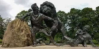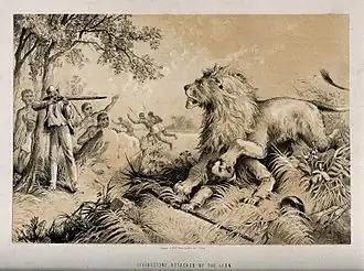 Lions often attacked the herds of the Mabotsa villagers, and on 16 February, Mebalwe and Livingstone joined them defending sheep.[30] Livingstone got a clear shot at a large lion, but while he was re-loading it attacked, crushing his left arm, and forced him to the ground. His life was saved by Mebalwe diverting its attention by trying to shoot the lion. He too got bitten. A man who tried spearing it was attacked just before it dropped dead.[31][32]