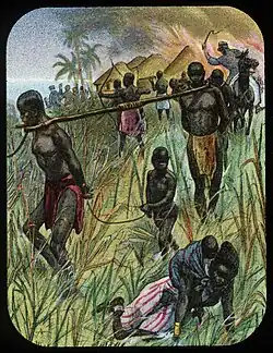 The cause behind this attack is stated to be retaliation for actions of Manilla, the head slave who had sacked villages of Mohombo people at the instigation of the Wagenya chieftain Kimburu. The Arabs attacked the shoppers and Kimburu's people.[60][61]