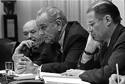 On September 7, 1964, Johnson assembled his national security team to seek a consensus about what to do about Vietnam.[61] Rusk advised caution, arguing that Johnson should embark on military measures only after diplomacy had been exhausted.[62] In September 1964, Rusk grew frustrated with the endless infighting amongst South Vietnam's junta of generals and after a failed coup d'état against Nguyễn Khánh sent a message to Maxwell Taylor, the ambassador in Saigon, on September 14, stating he was to "make it emphatically clear" to Khánh and the rest of the junta that Johnson was tired of the infighting.[63] Rusk also instructed Taylor to say: "The United States has not provided massive assistance to South Vietnam, in military equipment, economic resources, and personnel in order to subsidize continuing quarrels among South Vietnamese leaders."[63] Reflecting the general vexation with South Vietnam's chronic political instability in Washington, Rusk argued to Johnson: "Somehow we must change the pace at which these people move, and I suspect that this can only be done with a pervasive intrusion of Americans into their affairs."[64] Increasingly, the feeling in Washington was if South Vietnam could not defeat the Viet Cong guerrillas on its own, the Americans would have to step in and win the war that the South Vietnamese had proved incapable of winning.[64] On September 21, Rusk said the US would not be pushed out of the Gulf of Tonkin and that the prevention of it becoming a "communist lake" would be assured by the continued presence of American forces there.[65]