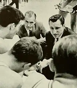 Smith was commissioned as a second lieutenant on June 7, 1954, in the U.S. Air Force and was stationed at Fürstenfeldbruck Air Base in Germany where he was on a team that won the Air Force championship for Europe.[12] He later worked as a head coach of United States Air Force Academy's baseball and golf teams.[11] Yet, Smith's big break would come in the United States. In 1958, North Carolina coach Frank McGuire asked Smith to join his staff as an assistant coach.[11] Smith served under McGuire for three years until 1961, when McGuire was forced to resign by Chancellor William Aycock in the wake of a major recruiting scandal, and consequently, an NCAA mandated probation.