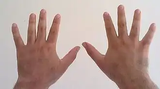 Many ancient cultures calculated with numerals based on ten, perhaps because two human hands have ten fingers.[15] Standardized weights used in the Indus Valley Civilisation (c. 3300–1300 BCE) were based on the ratios: 1/20, 1/10, 1/5, 1/2, 1, 2, 5, 10, 20, 50, 100, 200, and 500, while their standardized ruler – the Mohenjo-daro ruler – was divided into ten equal parts.[16][17][18] Egyptian hieroglyphs, in evidence since around 3000 BCE, used a purely decimal system,[19] as did the Linear A script (c. 1800–1450 BCE) of the Minoans[20][21] and the Linear B script (c. 1400–1200 BCE) of the Mycenaeans. The Únětice culture in central Europe (2300-1600 BC) used standardised weights and a decimal system in trade.[22] The number system of classical Greece also used powers of ten, including an intermediate base of 5, as did Roman numerals.[23] Notably, the polymath Archimedes (c. 287–212 BCE) invented a decimal positional system in his Sand Reckoner which was based on 108.[23][24] Hittite hieroglyphs (since 15th century BCE) were also strictly decimal.[25]