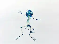 There is considerable evidence that parasitic trematode platyhelminths (a type of fluke) have contributed to developmental abnormalities and population declines of amphibians in some regions.[21] These trematodes of the genus Ribeiroia have a complex life cycle with three host species. The first host includes a number of species of aquatic snails. The early larval stages of the trematodes then are transmitted into aquatic tadpoles, where the metacercariae (larvae) encyst in developing limb buds. These encysted life stages produce developmental abnormalities in post-metamorphic frogs, including additional or missing limbs.[6] These abnormalities increase frog predation by aquatic birds, the final host of the trematode.