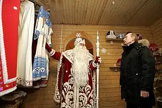 Ded Moroz is very popular in modern Russia.[9] In 1998, the town of Veliky Ustyug in Vologda Oblast, Russia was declared the home of the Russian Ded Moroz by Yury Luzhkov, then Mayor of Moscow.[10] Between 2003 and 2010, the post office in Veliky Ustyug received approximately 2,000,000 letters from within Russia and from all over the world for Ded Moroz.[10][11][12][13][14] On 7 January 2008, then President Putin of the Russian Federation visited Ded Moroz' residence in the town of Veliky Ustyug as part of the Russian Orthodox Christmas Eve celebration.[15]