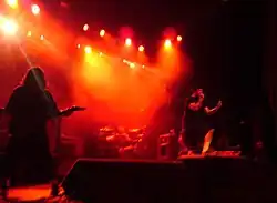 ![]() Deftones performing at the Shepherd's Bush Empire in 2011; from left to right: Carpenter, Cunningham, Moreno, and Vega | |
