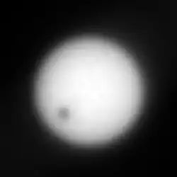 Deimos regularly passes in front of the Sun as seen from Mars. It is too small to cause a total eclipse, appearing only as a small black dot moving across the Sun. Its angular diameter is only about 2.5 times the angular diameter of Venus during a transit of Venus from Earth. On 4 March 2004 a transit of Deimos was photographed by Mars rover Opportunity, and on 13 March 2004 a transit was photographed by Mars rover Spirit.