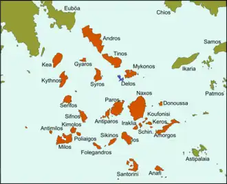 ![]() Delos (on the right) and Rineia in the Cyclades | |