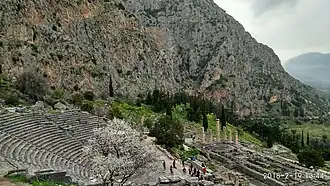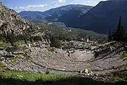 The ancient theatre at Delphi was built farther up the hill from the Temple of Apollo giving spectators a view of the entire sanctuary and the valley below.[22] It was originally built in the fourth century BC, but was remodeled on several occasions, particularly in 160/159 B.C. at the expenses of king Eumenes II of Pergamon and, in 67 A.D., on the occasion of emperor Nero's visit.[23]