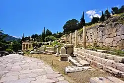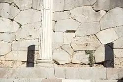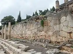 A retaining wall was built to support the terrace housing the construction of the second temple of Apollo in 548 BC. Its name is taken from the polygonal masonry of which it is constructed. At a later date, from 200 BC onwards, the stones were inscribed with the manumission (liberation) contracts of slaves who were consecrated to Apollo. Approximately a thousand manumissions are recorded on the wall.[32]