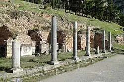 The first set of remains that the visitor sees upon entering the archaeological site of Delphi is the Roman Agora, which was just outside the peribolos, or precinct walls, of the sanctuary of Apollo at Delphi. The Roman Agora was built between the sanctuary and the Castalian Spring, approximately 500 meters away.[33] This large rectangular paved square used to be surrounded by Ionic porticos on its three sides.[34] The square was built in the Roman period, but the remains visible at present along the north and northwestern sides date to the Late Antique period.