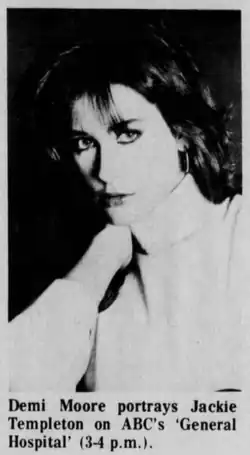 Moore made her film debut as the protagonist's girlfriend in Choices (1981), a sports drama directed by Silvio Narizzano.[52] It did not garner much attention until after Moore became a household name, with home video releases heavily hyping up her appearance.[53] Her second feature was the 3-D sci-fi horror Parasite (1982), for which director Charles Band had instructed casting director Johanna Ray to "find me the next Karen Allen".[48] It proved to be a minor hit on the drive-in circuit, ultimately grossing $7 million.[54] Moore had already joined the cast of the ABC soap opera General Hospital several months before the film's release, playing the role of investigative reporter Jackie Templeton through 1983. During her tenure on the series, she made an uncredited cameo appearance in the 1982 spoof Young Doctors in Love.