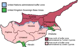 • United Nations Buffer Zone in Cyprus: The United Nations Security Council created a buffer zone separating the self-proclaimed, internationally unrecognized Turkish Republic of Northern Cyprus from the Republic of Cyprus. It was authorized by Resolution 186 and is patrolled by the United Nations Peacekeeping Force in Cyprus.