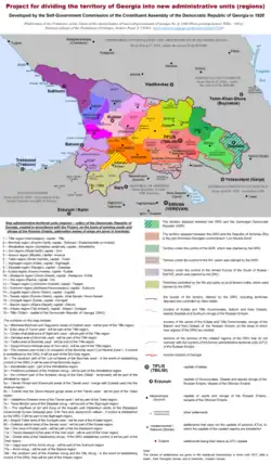 During the Democratic Republic of Georgia, in accordance with the Project for dividing the territory of Georgia into new administrative units (regions), developed by the Self-Government Commission of the Constituent Assembly of the Democratic Republic of Georgia in 1920 (Publication of the Committee of the Union of the elected bodies of local self-government of Georgia No. 2, 1920 (State printing house), Tiflis. – 103 p.; National Library of the Parliament of Georgia, Archive Fund, F 7.876/4 – პროექტი საქართველოს ტერიტორიის დანაწილებისა ახალ საადმინისტრაციო ერთეულებად (ოლქებად)) the division into Governorates and Oblasts was eliminated, uezds and okrugs were preserved, renamed to regions. The names of the regions were mainly proposed by the names of their administrative centers. Minor changes were made to their borders and several former uezds and okrugs were united: Batumi and Artvin okrugs – into the Batumi region, Akhaltsikhe and Akhalkalaki uezds – into the Akhaltsikhe region, Dusheti and Tianet uezds into the Ananuri region. In addition, three autonomous entities were created: Abkhazian autonomy (Sukhumi region), Autonomy of Muslim Georgia (Batumi region) and Zagatala region. Two-level local self-government was introduced: 18 regions and equivalent to regions, the capital of Georgia – Tiflis (Tbilisi) at the regional level and 356 cities and communities at the local level. The southern part of the Ardahan district and the Olta district – if the Democratic Republic of Georgia establishes control over them, will be part of the created Artaani region.