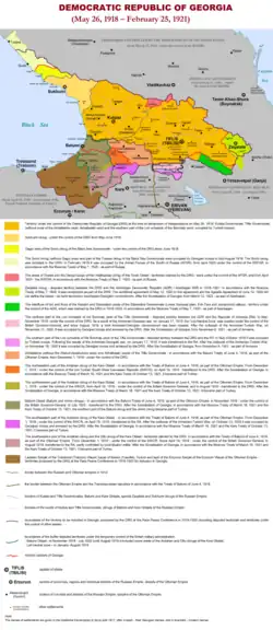 Initially, DRG was a protectorate of the German Empire. However, after the German defeat in World War I, the country was partially occupied by British troops, who were sent there to counter a proposed Bolshevik invasion. The British had to leave in 1920 because of the Treaty of Moscow, in which Russia recognized Georgia's independence in exchange for DRG not hosting forces hostile to Russia's interests.[2] Now that Western European powers were no longer present in Georgia, in February 1921 the Bolshevik Red Army proceeded to invade the country, leading to DRG's defeat and collapse by March of that year, with Georgia becoming a Soviet republic. The Georgian Government, led by Prime Minister Noe Zhordania, moved to France where it continued to work in exile. The government-in-exile was recognized by France, Britain, Belgium, and Poland as the only legitimate government of Georgia until the 1930s, when growing Soviet power and political processes in Europe made it impractical to do so indefinitely.[3]