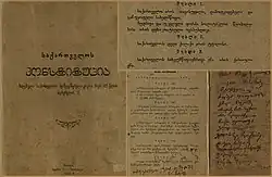 1. ^ საქართველოს პირველი რესპუბლიკის კონსტიტუცია (1918–1919), ტომი I. Tbilisi: Georgian National Parliamentary Library; Irida LLC. 2015. ISBN 978-9941-0-8187-3. Retrieved 5 November 2025.