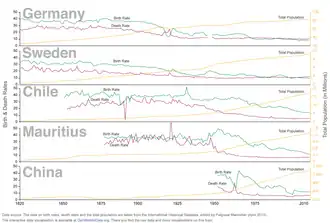Demographic change in Germany, Sweden, Chile, Mauritius, and China from 1820 to 2010. (Pink lines—crude death rate (CDR); green lines—crude birth rate (CBR); yellow lines—population)