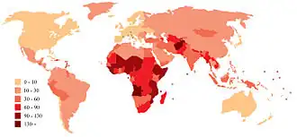 - ^ Hotez, Peter J.; Kamath, Aruna (25 August 2009). "Neglected Tropical Diseases in Sub-Saharan Africa: Review of Their Prevalence, Distribution, and Disease Burden". PLOS Neglected Tropical Diseases. 3 (8): e412. doi:10.1371/journal.pntd.0000412. PMC 2727001. PMID 19707588.