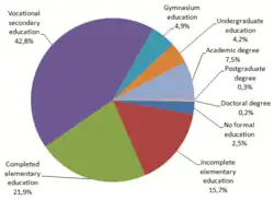 Croatian is the official language, but minority languages are officially used in some local government units. Croatian is declared as the native language by 95.60% of the population. A 2009 survey revealed that 78% of Croatians claim knowledge of at least one foreign language—most often English. The main religions of Croatia are Roman Catholic (86.28%), Eastern Orthodoxy (4.44%) and Islam (1.47%). Literacy in Croatia stands at 98.1%. The proportion of the population aged 15 and over attaining academic degrees grew rapidly since 2001, doubling and reaching 16.7% by 2008. An estimated 4.5% of the GDP is spent for education. Primary and secondary education are available in Croatian and in languages of recognised minorities. Croatia has a universal health care system and in 2010, the nation spent 6.9% of its GDP on healthcare. Net monthly income in August 2023 averaged 1,163 euro. The most significant sources of employment in 2023 were manufacturing industry, wholesale and retail trade and construction. In August 2023, the unemployment rate was 6.9%. Croatia's median equivalent household income tops average Purchasing Power Standard of the ten countries which joined the EU in 2004, while trailing the EU average. 2011 census recorded a total of 1.5 million private households, which predominantly owned their own housing. The average urbanisation rate in Croatia stands at 56%, with an augmentation of the urban population and a reduction of the rural population.