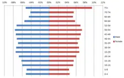In 2014, there were 39,566 live births in Croatia, comprising 20,374 male and 19,192 female children. Virtually all of those were performed in medical facilities; only 19 births occurred elsewhere. Out of the total number, 32,677 children were born in wedlock or within 300 days after the end of the marriage, and the average age of mothers at the birth of their first child was 28.4 years.[20] General fertility rate, i.e. number of births per 1,000 women aged 15–49 is 42.9, with the age specific rate peaking at 101.0 per million for women aged 25–29. In 2009, 52,414 persons died in Croatia, 48.5% of whom died in medical facilities and 90.0% of whom were receiving medical treatment at the time. Cardiovascular disease and cancer were the primary causes of death in the country, with 26,235 and 13,280 deaths respectively. In the same year, there were 2,986 violent deaths, including 2,121 due to accidents. The latter figure includes 616 deaths in traffic accidents.[7] In 2014, the birth rate was 9.3 per mille, exceeded by the mortality rate of 12.0 per mille. The infant mortality rate was 5.0 per mille in 2014.[5] In terms of age structure, the population of Croatia is dominated by the 15–64 year older segment (68.1%), while the size of the population younger than 15 and older than 64 is relatively small (15.1% and 16.9% respectively). The median age of the population is 41.4. The sex ratio of the population is 1.06 males per 1 female at birth and up to 14 years of age, and 0.99 males per 1 female between the ages of 15 and 64. But at ages over 64 the ratio is 0.64 males per 1 female. The ratio for the total population is 0.93 males per 1 female.[9]