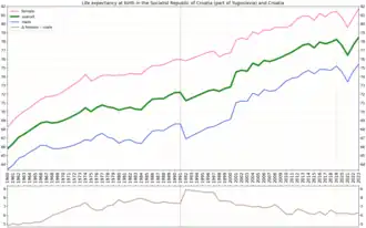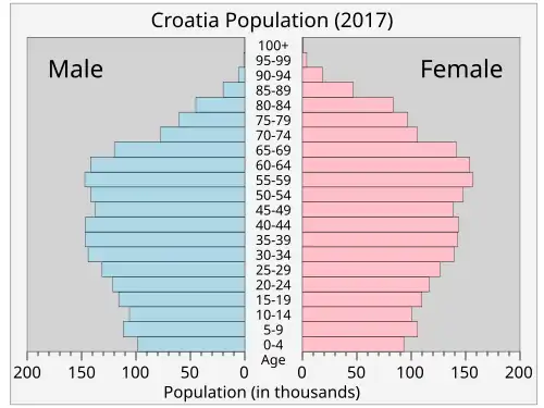 The demographic characteristics of the population of Croatia are known through censuses, normally conducted in ten-year intervals and analysed by various statistical bureaus since the 1850s. The Croatian Bureau of Statistics has performed this task since the 1990s. The latest census in Croatia was performed in autumn of 2021. According to final results published on 22 September 2022 the permanent population of Croatia at the 2021 census (31st Aug) stood at 3.87 million. The population density is 68.7 inhabitants per square kilometre, and the overall life expectancy in Croatia at birth was 78,2 years in 2018.[3] The population rose steadily (with the exception of censuses taken following the two world wars) from 2.1 million in 1857 until 1991, when it peaked at 4.7 million. Since 1991, Croatia's death rate has continuously exceeded its birth rate; the natural growth rate of the population is negative. This population drop is also caused by emigration rates. Because of this, Croatia's population fell below 4 million again in 2018, and the apex of its mass emigration occurred in 2022, while population didn't increase again until 2023 due to immigration compensating for the negative natural change. Croatia is in the fourth (or fifth) stage of the demographic transition. In terms of age structure, the population is dominated by the 15 to 64 year‑old segment. The median age of the population is 43.4, and the gender ratio of the total population is 0.93 males per 1 female.