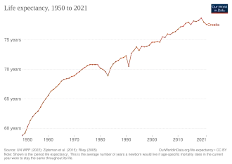 With a population of 3,871,833 in 2021, Croatia ranks 128th in the world by population.[4] Its population density is 75.8 inhabitants per square kilometre. The overall life expectancy in Croatia at birth is 78 years.[3]